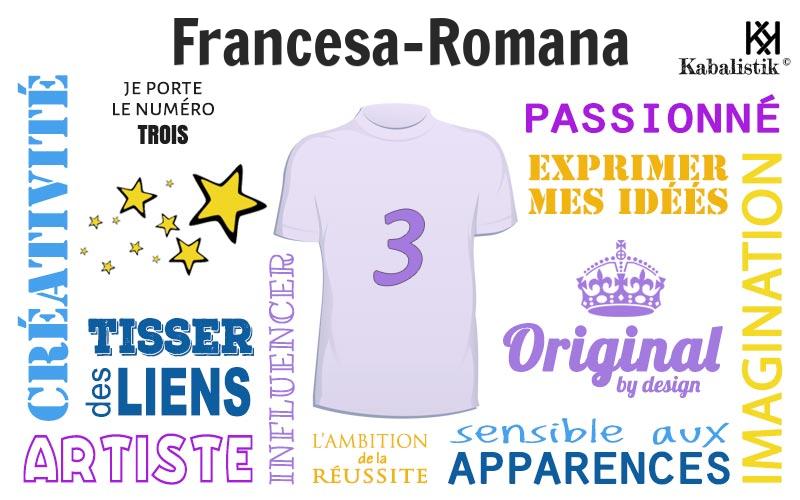 La numérologie attribue le nombre 3 au prénom Francesa-Romana. Découvrez sur cette page comment, et quelle signification y est associée.